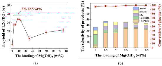 The effect of alkali modification by loading Mg(OH)2 on the catalyst system was studied after dealumination modification and metal modification. When the loading amount of Mg(OH)2 is 2.5 wt%, the yield of 1,2-PDO promotes rapidly (Figure 3a). The increase is approximately six times that without Mg(OH)2 loading, suggesting that the loading of Mg(OH)2 indeed improves the formation of 1,2-PDO. Then, the yield of 1,2-PDO advances gradually with the enhancement of the Mg(OH)2 loading until the yield of Mg(OH)2 loading of 7.5 wt% reaches the maximum value, and the yield of 1,2-PDO is approximately 34.1% (Figure 3a). The loading of Mg(OH)2 begins to decrease the production of 1,2-PDO at around 12.5 wt%, where the yield of 1,2-PDO is at a high level of 32.7%. With the improvement in alkali loading, the selectivity of 1,2-HDO decreases significantly, which confirms that the loading of Mg(OH)2 could effectively inhibit the formation of 1,2-HDO and promote the selectivity of 1,2-PDO conversion (Figure 3b). However, the yield reduces after a large amount of loading. The excessive loading of Mg(OH)2 may not be conducive to converting DHA to 1,2-PDO. In summary, the optimal loading of the Mg(OH)2 catalyst is 7.5 wt%.