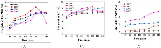 When the temperature rises from 180 °C to 200 °C, the yield of 1,2-PDO improves to a certain extent, and the maximum yield reaches 34.1% at 200 °C after 3 h of reaction. When the temperature increases from 220 °C, the peak yield of 1,2-PDO decreases significantly (Figure 5a). With the improvement of the reaction process and the temperature, the yield of EG advances tardily, remaining between 5.0% and 8.0% (Figure 5b). The promotion effect of improving the temperature on the formation of NPA is the strongest (Figure 5c). It is because, at high-temperature conditions, 1,2-PDO continues to decompose into large amounts of EG and NPA, which reduces the yield of 1,2-PDO. Therefore, the optimal reaction conditions in the catalytic system are a temperature of 200 °C and a time of 3 h.
