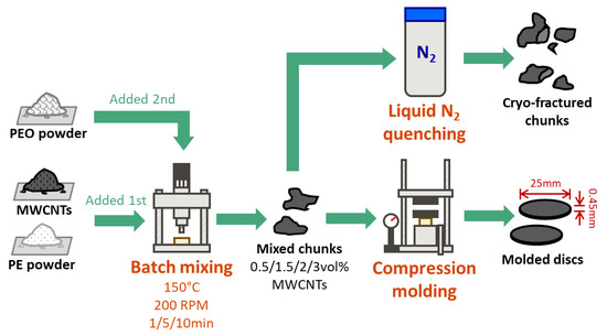 PBN samples with a PEO/PE ratio of 40:60 were prepared at MWCNT concentrations of 0.5, 1.5, 2, and 3 vol% using two-step mixing. MWCNT powder and PE powder were dry mixed and added to the mixing cup of an Alberta Polymer Asymmetric Mini-mixer (APAM) (University of Calgary, Calgary, AB, Canada) and left to melt for 2 min without rotation [33]. The mixture was then melt-compounded at 200 rpm for 5 min to create a well-mixed PE/MWCNT composite. Mixing was then halted, and PEO powder was introduced to the mixing cup, and left to melt for 2 min without rotation. Finally, the mixture was melt-compounded at 200 rpm for an additional 1, 5, and 10 min. All melting and mixing steps in the APAM were done at a constant temperature of 150 °C. Samples were rapidly removed at the end of the final blending step and chunks of the sample were quenched in liquid nitrogen to freeze the sample morphology. The rest of the sample was molded into circular discs (diameter = 25 mm, thickness = 0.45 mm) using a Carver compression molder (model 3912) (Carver Inc., Wabash, IN, USA) at 150 °C and 35 MPa for 10 min. A minimum of four specimens were prepared for each sample to measure electrical conductivity, EMI shielding and rheological properties. An outline of the procedure for preparing PEO/PE/MWCNT samples can be found in Figure 1 below.