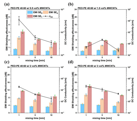 Figure 4 shows the effect of mixing time and MWCNT concentration on the final observed DC electrical conductivity (σDC) and EMI SE of PEO/PE 40:60 blends containing MWCNTs. σDC and EMI SE values for PEO and PE nanocomposites containing 3 vol% MWNCTs were also prepared to serve as a baseline, and the results can be found in Figure S6 of the Supplemental Materials. PEO/PE 40:60 blends at all MWCNT concentrations (Figure 4a,c,d) showed a decrease in the values of EMI SE and σDC with increasing mixing time. The overall decreasing trend can likely be attributed to the migration of MWCNTs from the PE phase into PEO, resulting in a breakdown of the conductive network. With MWCNTs localizing in both phases, double percolation no longer exists, i.e., because of the dilution of MWCNT concentration in PE phase, there is a reduction in the extent of MWCNT network formation. The high initial electrical properties can likely be attributed to MWCNTs forming a percolated network within PE exclusively, because of the firs mixing step before PEO was added. The most significant mechanism of EMI attenuation in all prepared 40:60 samples was absorption, which is common for PBNs [7]. PBNs tend to absorb incident EMI because the relatively miniscule quantity of MWCNTs at the surface of the samples allows EM waves to easily penetrate the bulk of the sample. Once within the sample, the electric and magnetic fields generated by the incident EM wave interact with the electric and magnetic dipoles within the embedded MWCNTs, leading to dissipation through ohmic losses.