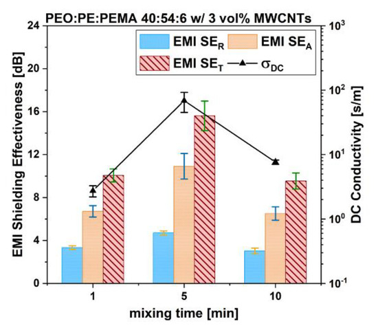Figure 9 shows the EMI SE and σDC values for PEO/PE/PEMA 40:54:6 blends containing 3 vol% MWCNTs. Because PEMA is more polar than PE, MWCNT may tend to move near the PEMA molecules. The electrical properties at 1 min of mixing are quite low, possibly due to MWCNTs concentrating in and around the PEMA phase within PE at the onset of mixing, leading to a loss of continuity in the MWCNT network. At 5 min of mixing however, there is a huge rise in both EMI SE and σDC. These values are even higher than the 40:60 blends with 3 vol% MWCNTs at 1 min mixing (15.6 dB and 68.7 S/m compared to 14.1 dB and 22.1 S/m), marking a significant improvement in the MWCNT network for the compatibilized blend. This improvement is likely due to MWCNTs being concentrated at the interface of the blend at 5 min, as evidenced by SEM images. The subsequent drop in properties at 10 min of mixing is likely due to MWCNTs finally crossing into PEO.
