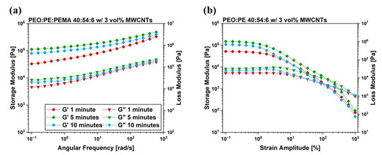 Figure 10 shows linear frequency and strain sweeps for 40:54:6 blends containing 3 vol% MWCNTs. As expected, 1 min of mixing yielded the lowest G’ and G’’ values at low angular frequencies (Figure 10a), likely due to no MWCNTs being present in PEO, and an inability of MWCNTs to form networks within the PE phase. At 5 min of mixing, the viscoelastic moduli rise sharply. This is due to the high degree of MWCNTs networks present within the blend, likely concentrated along the PEO/PE interface at this point. Furthermore, the critical strain in Figure 10b for 40:54:6 blends mixed for 5 min occurs at a substantially higher strain than at other times, suggesting a robust MWCNT network at this point. Although 1 min and 10 min samples yielded similar electrical properties, the values of G’ and G’’ are substantially higher at 10 min than at 1 min. This difference between the electrical and rheological properties is due to MWCNTs being more uniformly dispersed throughout both PE and PEO phases at 10 min, whereas at 1 min, MWCNTs are confined to the PE phase.