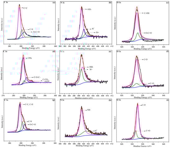 XPS high-resolution spectra of (a) C1s of PANi@FG, (b) N1s of PANi@FG, (c) O 1s of PANi@FG, (d) C 1s of PANi/PMMA@FG, (e) N1s of PANi/PMMA@FG, (f) O 1s of PANi/PMMA@FG, (g) C 1s of PANi/PMMA/PPG-b-PEG-b-PPG@FG, (h) N 1s of PANi/PMMA/PPG-b-PEG-b-PPG@FG @FG and (i) O 1s of PANi/PMMA/PPG-b-PEG-b-PPG@FG @FG.