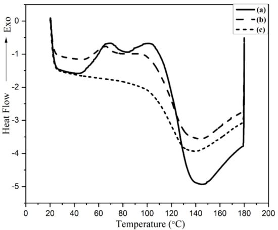 DSC thermograms of (a) PANi@FG, (b) PANi/PMMA@FG and (c) PANi/PMMA/PPG-b-PEG-b-PPG@FG nanocomposites.