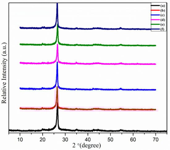 The crystalline behavior of the PANI@FG, PANI/PMMA@FG and fabricated multilayered composites I, II and III was investigated by XRD studies. The interlayer distance was predicted using Bragg’s law. The 2θ scan in the range of 10–70° showed the XRD pattern of PANi/PMMA/PPG-b-PEG-b-PPG@FG nanocomposites, as presented in Figure 7. The diffractogram of multilayered PANi@FG, PANi/PMMA@FG and PANi/PMMA/PPG-b-PEG-b-PPG@FG nanocomposites indicated a diffraction peak at 2θ = 27, 26.7 and 26.5°, respectively, while diffraction peaks for composites with change of concentration were visible around 2θ = 26.8, 26.5 and 26.1° accordingly. The peak located at 26 is related to the 002 plane of graphite [32]. The appearance of the characteristic sharp peak at around 2θ = 25–27 depicts that the synthetic procedure was able to successfully insert the functionalized graphite particulates in various polymer networks without affecting the growth of polymer, which still retains its crystalline structure. Noticeably, it is worth mentioning that successful deposition of polymers is clearly evidenced by the shift of diffraction peaks towards lower angle. The typical d-spacing is presented in Table S4. The tabulated data indicate the slight shift of peak with decreased peak intensity, which is attributed to increased interlayer distance owing to polymerization leading to expansion of graphite layers. In addition, this shift of peak towards lower angle adds to the evidence of breakage of regular graphitic structure constituting stacked layers, which is also consistent with SEM images. The two crystal planes of PANi are reflected by the appearance of two peaks centered at 2θ = 20 and 25°, which are associated with periodicity parallel and perpendicular to polymer chains [10,16,24].