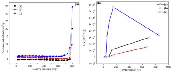 (A) BET adsorption–desorption isotherms for (a) PANi@FG, (b) PANi/PMMA@FG and (c) PANi/PMMA/PPG-b-PEG-b-PPG@FG. (B) BJH pore size distribution curves for (a) PANi@FG, (b) PANi/PMMA@FG and (c) PANi/PMMA/PPG-b-PEG-b-PPG@FG.
