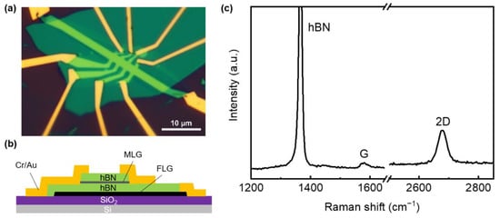 Figure 1a shows the optical image of the device. Our graphene device is made of vdW heterostructure on a silicon substrate as it shows in Figure 1b. The heterostructure is mainly composed of exfoliated MLG, which is encapsulated with hBN as the dielectric layer. The Raman spectra of hBN/MLG/hBN is shown in Figure 1c, the characteristic peak of hBN is at 1366 cm−1 and the characteristic G and 2D peak of monolayer graphene is at 1578 cm−1 and 2678 cm−1, respectively. We notice the G peak intensity of graphene is rather low due to the coverage of hBN, but the 2D peak is symmetrical, which accords with the Raman 2D peak of monolayer graphene. The low charged defect density in hBN can improve the carrier mobility [36], and then FLG is used as the graphite-gated electrode to shield the disorder of charged impurities in the silicon substrate [37], which can also improve the carrier mobility and reduce the inhomogeneity of charge [38,39]. At the same time, in order to reduce the contact resistance between graphene and metal electrode and realize the accurate measurement of the QHE, we use a one-dimensional edge contact method to realize the ability of high-quality electrical contact [28]. Compared with conventional surface contact [40,41,42,43], edge contact can reduce the doping of graphene in the process of metal evaporation [44,45], and can effectively reduce the contact resistance, so as to achieve high electronic performance [46] and make the carrier mobility of graphene devices close to the limit [21].
