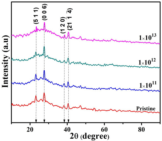 Figure 2 shows the XRD patterns of pristine and irradiated In2(Te0.98Se0.02)3 films. The peak positions at 2θ = 40.69° corresponded to the (21 ) plane of the In2(Te Se)3, agreeing with the standard JCPDS diffraction data (File number 76-1182). Comparing the pure In2Se3 and In2Te3 phase, a peak at 23.15° assigned to the pure In2Te3 phase of the film exhibited the preferential orientation of the (5 1 1) plane (JCPDS 16-0445). Further, the peaks at diffraction angles 2θ = 27.68° and 38.53° were assigned to the (0 0 6) and (1 2 0) planes, respectively, of γ-In2Se3 in pristine and irradiated films (JCPDS file number 71-0250). However, the formation of pure In2Se3 and the In2Te3 phase in the present work was compared with the available literature. Matheswaran et al. prepared InTe thin films and reported the existence of mixed phases in XRD patterns that include In2Te3 and In2Te5 phases [26,27]. Niranjan et al. prepared InSe thin films and showed the presence of InSe, In4Se3, and γ-In2Se3 phases. Comparing these results with the present work, the formation of pure γ-In2Se3 and In2Te3 phases along with preferential orientation also agreed with this literature. The reason for the formation of the In2Se3 and In2Te3 phase compounds can be simplified by considering the electronegativity difference among the choice of materials. The elements having high electronegativity differences may have high binding strength [28], and the elements with a small difference in electronegativity may induce poor stability of a compound [29]. For instance, the elements In, Te, and Se have 1.78, 2.10, and 2.54 Pauling, respectively. Among these elements, the electronegativity difference is higher for the In–Se system (0.76) compared to those of the In–Te (0.32) and Se–Te (0.44) systems. By considering these facts, we assume that there may be a possible chance to form a dominant In2Se3 phase primarily due to the high electronegative difference (0.76) and the rest of the compounds later (other possible phases).