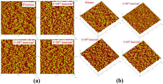 Therefore, ion beam-induced fragmentation or recrystallization reduces grain size under high energy irradiation, which causes melting followed by recrystallization. From the AFM image, the observed average grain size was about 30 nm for the pristine sample, i.e., the scanned image size was larger in AFM (5 µm). While AFM gave more information about these surfaces, the SEM image provided details of the grains. Grains were composed of many crystallites, and the estimated grain size in the SEM image was about 100 nm, as pointed out in Figure 4. In the present case, it seems that grains observed in SEM images were also composed of many crystallites with a size of about 20 nm. Further, it is clear that both SEM and AFM showed very similar kinds of spherical shaped images with different magnifications, and also it seemed that larger grains were composed of many crystallites for the pristine sample.