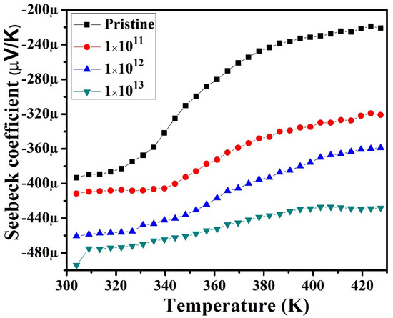 The Seebeck measurement is performed by creating a temperature difference using the differential method [25]. The average temperature difference is measured by creating the temperature difference in both directions and taking the average of both. The resistivity is measured in a four-probe mode. Figure 5 presents the measured S of In2(Te0.98Se0.02)3 at 300 K to 420 K temperature. The negative S value suggested the dominance of electron charge carriers in all samples. The observed S value for the pristine sample was ~221 µVK−1. The S value was found to increases with ion fluence to about ~427 µVK−1 for 1E13. This result indicated that S increased with increases in the ion fluence to a maximum (1E13), showing double the value of the pristine sample. Notably, S increased linearly with temperature for In–Se–Te, suggesting possible semiconducting behavior. The improved S value was evidence of an enhanced PF value in irradiated In2(Te0.98Se0.02)3 films. The observed S values consistent with the measured S of the n-type of In–Se-based chalcogenides reported by Dhama et al., were about −159 µVK−1 to −568 µVK−1 [8]. However, not much work has been explored on the thermoelectric performance of In2(Te0.98Se0.02)3 alloys, especially under SHI irradiation.