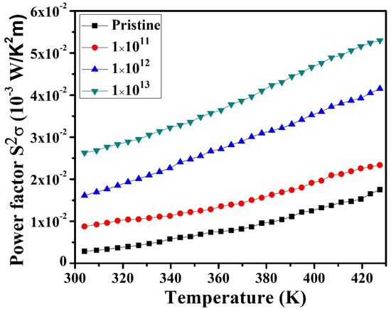 Figure 6 displays the measured PF for pristine and irradiated In2(Te0.98Se0.02)3 thin films. The maximum power factor at 400 K was found to be ~2.37 µW/K2m for 1E11, which displayed a higher PF value than the pristine sample (~1.23 µW/K2m). The PF value for 1E12 was about ~3.72 µW/K2m, better than that of the pristine sample. The PF value further increased to ~4.91 µW/K2m for 1E13, which was four times higher than that of the pristine sample. The effect of heavy ion irradiation on In2(Te0.98Se0.02)3 samples demonstrated considerable enhancement of both S and PF, which is evidence of the presence of more SHI-induced defects in the irradiated samples than in the as-deposited films. The PF values were found to exponentially increase with the ion fluence, which showed considerable enhancement in the irradiated samples as compared to the pristine samples. The higher value of the S led to an increase in the PF values of the irradiated samples. The higher S value for the irradiated sample was possibly because of grain fragmentation from large nanograins into tiny nanograins, as evidenced from FESEM analysis. Further, irradiation created defects inside the material, and these defect centers helped in charge carrier filtering, increasing the Seebeck coefficient (S), while these defects hindered the motion of charge carriers in conductivity measurements, leading to decreases in conductivity with irradiation. The heavy ion irradiation in the material resulted in the formation of point defects or defect clusters, which increased with ion fluence, and consequently the mobility of charge carriers across these defects decreased, thereby causing enhancement in thermopower. Bala et al. also reported a similar result that enhanced the thermoelectric properties of CoSb3 alloy by 100 MeV Ag ion irradiation [10].