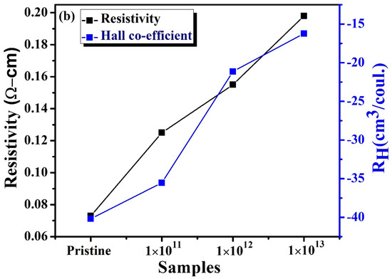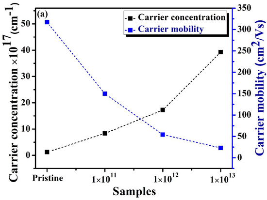 Table 3 displays the resistivity, carrier concentration, and Hall mobility of pristine and irradiated samples. The carrier concentration for the pristine sample was found to be 1.21 × 1018 cm−3. The carrier concentration at different ion fluences of 1E11, 1E12 and 1E13 were found to be about 8.35 × 1017, 17.24 × 1017, and 39.27 × 1017 cm−3, respectively (shown in Figure 8). The improvement in carrier concentration with an increase in the ion fluence may have been due to increases in defects such as vacancies or interstitial defects. The carrier concentrations were higher at room temperature for the irradiated films as compared to the pristine sample, which led to an increase in the electrical resistivity of the irradiated samples due to the decrease in the mobility of the charge carriers. Mostly, ion beam irradiation enhanced the resistivity due to the creation of defects. Hence, irradiated samples showed higher resistivity and revealed the presence of higher carrier concentrations and minimum carrier mobility that may have been a result of grain fragmentation. The higher carrier concentration in the irradiated samples also confirmed the presence of more defects.