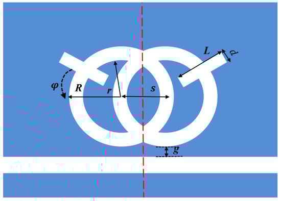 In consideration of the fact that the structure designed is much thicker than the surface depth of the SPP, we used a 2D model instead of a 3D model for simple calculations [24,25]. Figure 1 shows the 2D schematic of the structure. Figure 2 shows a three-dimensional model. The whole sensor is symmetrical along the centerline, and it consists of a waveguide with an inverted rectangle and an SRRDR. R and r, respectively, represent the outer radius and inner radius of the ring, the height of the waveguide rectangle is represented by H, the center distance of the double ring is represented by s, the length and width of the rectangular rod on the double ring are represented by L and d, and the rotation angle of the rectangular rod on the double ring is represented by φ, where g denotes the gap between the inverted rectangular waveguide and the SRRDR, and ω represents the width of the waveguide. The color area is filled with silver as the filling medium, the white part is filled with air, and the material of the base is medium quartz. The advantage of choosing silver as the filler metal is that it can ensure the high field of the system and reduce the power consumption. Regarding the fabrication of silver layers, we can prepare enough silver layers on the substrate by vapor deposition (CVD), and the desired structure is obtained by an electron beam etching method. We can calculate the relative permittivity of silver through the dispersion model [26,27] ().
