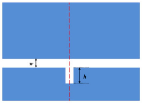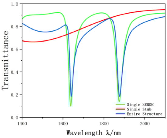 In order to better illustrate the transmission characteristics of the designed structure, we compare the whole system, single band reverse rectangular waveguide and the SRRDR structure. The reverse rectangular waveguide structure and the SRRDR structure are depicted in Figure 3 and Figure 4, respectively. The transmission spectrum of the whole system is shown in Figure 5. The green, blue, and red continuous lines shown represent the transmission spectra of the whole system, the single SRRDR structure, and the inverted rectangular waveguide structure, respectively. From the transmission plot, we can obtain the spectral information of a single SRRDR structure, with low transmittance and relatively symmetrical shape. This is similar to Lorentz resonance, which can be regarded as a narrowband mode directly excited by incident light, and the transmittance is low, so it is regarded as a narrowband mode. The entire curve of the transmission spectrum of a single inverted waveguide structure has a positive slope and has a high transmittance. Therefore, it is considered a continuous wideband mode. In the complete structure, we can see an obvious asymmetric curve, which indicates that the structure has a good Fano resonance phenomenon. The reason for this phenomenon is caused by the interaction between the continuous wideband state generated by the rectangular waveguide and the discrete narrowband state of a single SRRDR. Next, we will discuss the influence of different parameters on the transmission spectrum.