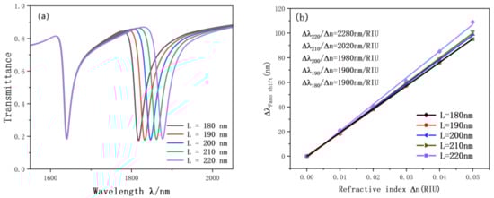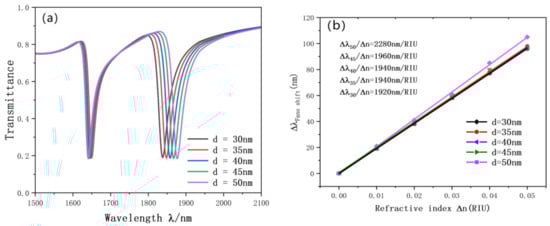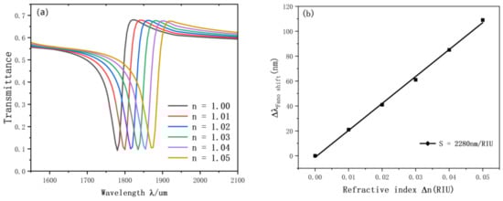 Initially, we studied the refractive index. We set up six different refractive data for experiments. The resonance diagram is shown in the figure, and the simulation results are shown in Figure 6a,b. With the increase of the equal distance of n, the transmission spectrum will also be an approximately equidistant red shift. We also performed linear fitting for the change of inclination wavelength. The optimal sensitivity of the sensor is 2280 nm/RIU, and the advantage value is 76.7.