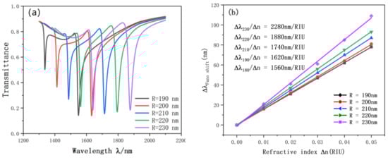 (a) Transmission spectrum of R variation; (b) the sensitivity of R changes to fit the line.