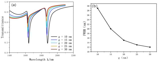 In order to further study the effect of the coupling gap. We superposed the coupling gap layer by layer from 10 nm to 30 nm. The research coupling results of the SRRDR and waveguide straight line are shown in the Figure 10a. The figure shows that with the continuous increase of g, the transmittance of the most obvious Fano resonance curve is increasing, which indicates that the coupling performance is greatly weakened. This will inevitably lead to a sharp deterioration in the performance of the sensor. In addition, the Fano curve is blue shifted. FWHM also tends to narrow. The FWHM diagram is shown in Figure 10b.