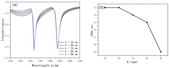 Finally, we studied the influence of the height of the reverse waveguide on the resonance curve. We gradually increased h from 50 nm to 90 nm. The simulation results are shown in Figure 11a. We can see that no matter how the height of the reverse rectangle changes, the inclination wavelength of the Fano resonance line and the projection rate has hardly changed. On the contrary, the reverse waveguide can enhance the coupling effect between SPP and the SRRDR. After adding the reverse waveguide, the Fano resonance curve becomes more obvious. FWHM has great influence on the monochromatic property of the light wave, and the proper length of the rectangular waveguide also has some influence on FWHM. Through experimental comparison, when h = 90 nm, FWHM becomes the smallest, 29 nm. The change diagram of FWHM is shown in Figure 11b.