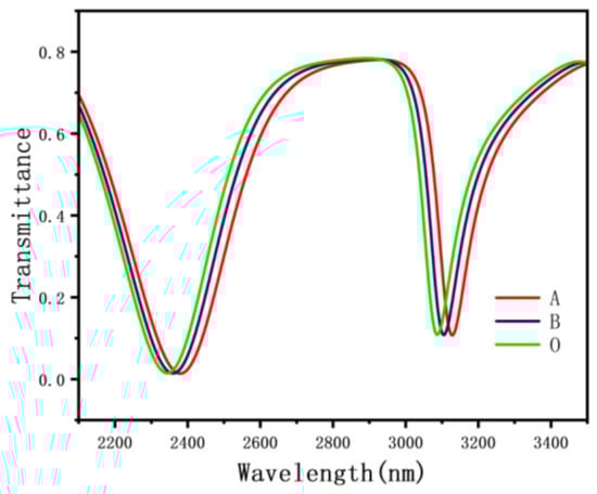 For the sensitivity of the structure to measure hemoglobin, the structure parameters were set as follows: r = 230 nm, r = 180 nm, l = 220 nm, and d = 50 nm. At this time, the structural sensitivity is 2280 nm/RIU. Considering the hemoglobin concentration range of the normal human body, the collection range is 108.9–146.2 g/L, which meets the working range of the sensor. With the increase of hemoglobin concentration of different blood types, the projection spectra of type A, type B, and type O blood have changed, and the Fano resonance curve has a red shift. This shows that even if the hemoglobin concentration changes significantly, the sensing data is still reliable, and due to the resonance splitting, the sensing structure can measure different concentrations of hemoglobin at the same time, which has a wider application.