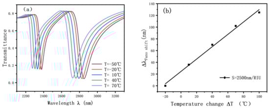 Considering that the boiling point of alcohol is about 78 °C and the temperature sensing data does not exceed 70 °C, Figure 13a shows that the alcohol temperature sensing also has a good sensing effect, and the resonance tilt wavelength will be blue-shifted as the temperature keeps rising. Moreover, the refractive index has a good linear relationship with temperature as shown in Figure 13b, and the accuracy of the sensor reaches 2500 nm/RIU. This demonstrates that the ethanol temperature-sensing structure has a good development space.