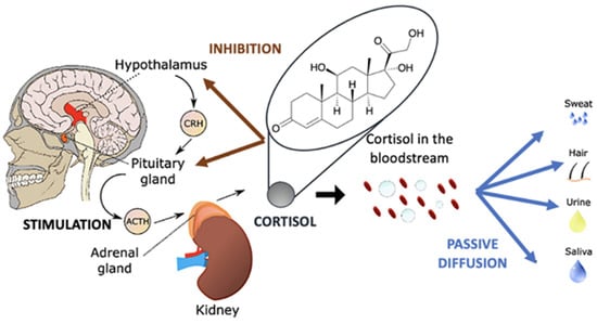 Mechanism of cortisol generation in the human body. Free cortisol is released into the bloodstream and diffused to different tissues (adapted with permission from [17]. Copyright 2020 Elsevier).
