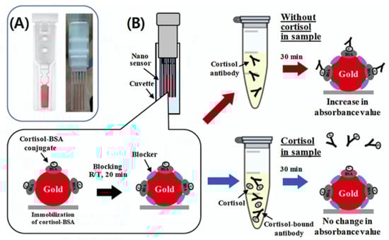 Jeon and co-workers have designed a new localized surface plasmon resonance-based cuvette-type sensor for the detection of cortisol, leading to rapid detection in human serum samples [46]. In particular, the nanosensor, called Plex NanoCuve, consists of a parallel assembly of four sensing strips, two protection strips, and two spacer strips. The principle of operation is based on the change in the local refractive index of gold nanoparticles upon binding to biomolecules, this change induces a shift in the localized surface plasmonic resonance (LSPR) wavelength [47,48]. In this nanosensor, conjugated cortisol binds bovine serum albumin (BSA) and is immobilized on plastic units coated with gold nanoparticles (Figure 2). Cortisol was detected in PBS solution and serum (within 20 min) at concentrations between 1 and 10,000 ng/mL, values comparable to that of the traditional enzyme-linked immunosorbent assay (ELISA), which typically requires more than 4 h and complex sample preparation. The few amounts of samples (200 μL) required for a single analysis and the relatively quick time for the analysis should be fine for space applications after reducing or changing the readout system and obtaining a portable device.