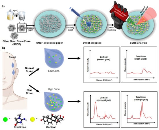 Kim and co-workers presented a new sensor to simultaneously detect creatinine (an important bioindicator of kidney function) and cortisol in sweat using a portable Raman spectrometer [52] (Figure 4). They fabricated silver nano snowflakes (SNSFs) on a SERS (surface-enhanced Raman scattering) substrate and hydrophobic filter paper using the polyol method [53]. In particular, the sensor was created by synthesizing a colloidal suspension of SNSF according to the polyol method reported in the literature [54]. This substrate facilitates the simultaneous detection of creatinine and cortisol and allows measurement on small sample volumes of human sweat (2 μL). Notably, the possibility to use a hand-held Raman spectrometer for these measurements leads to real applicability in a space mission.