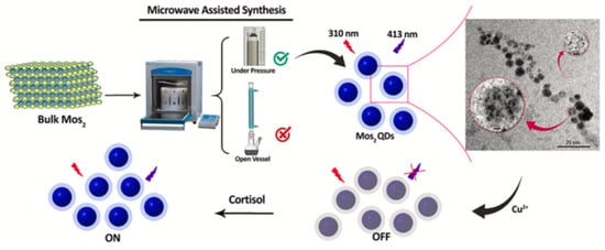 Mohammad-Andashti and co-workers prepared an on-off fluorescent sensor for the detection of cortisol [55], based on highly luminescent MoS2 quantum dots (QDs) obtained by simple, environmentally friendly, and green microwave exfoliation (Figure 5). Specifically, high-fluorescence MoS2 quantum dots were prepared by mixing MoS2 powder with ammonium hydroxide and deionized water, transferred to a Teflon microwave vessel, hermetically sealed, and placed in a microwave oven. The detection of cortisol used an on–off protocol, in that some cations (such as Cu2+, Pb2+, Cd2+, Ag+, Fe3+, and Al3+) switched off the luminescence intensity of MoS2 QDs, but then the luminescence of MoS2 QDs-Ag+ and Cu2+ mixtures was recovered with the addition of cortisol, with a higher emission recovery for the Cu2+ ion. This occurs because cortisol interacts with copper ions through its hydroxyl and carbonyl groups leading to a copper-cortisol complex, which releases copper from the surface of MoS2, resulting in the recovery of the emission intensity of MoS2 QDs.
