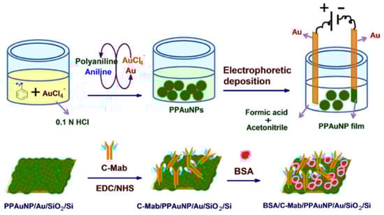 Schematic illustration of the fabrication of the BSA/C-Mab/PPAuNP/Au electrode for cortisol detection (reproduced with permission from [62]. Copyright 2015 Elsevier).
