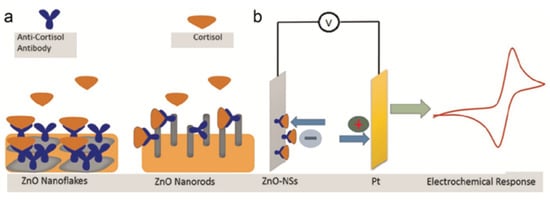 (a) The fabrication of the electrochemical immunosensor for the detection of cortisol based on ZnO-NRs and ZnO-NFs, prepared by the sonochemical method and the immobilization of the anti-cortisol monoclonal antibody on ZnO-NSs (b) Response obtained by the CV of the fabricated electrodes (reproduced with permission from [63]. Copyright 2015 Elsevier).