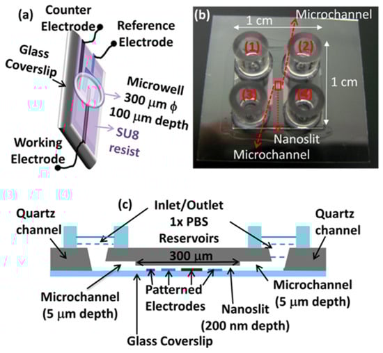 (a) Schematic view of the microwell device; (b) top view of the nanoslit device; and (c) schematic cross-sectional view of the nanoslit geometry (reproduced with permission from [65] Copyright 2015 Elsevier).