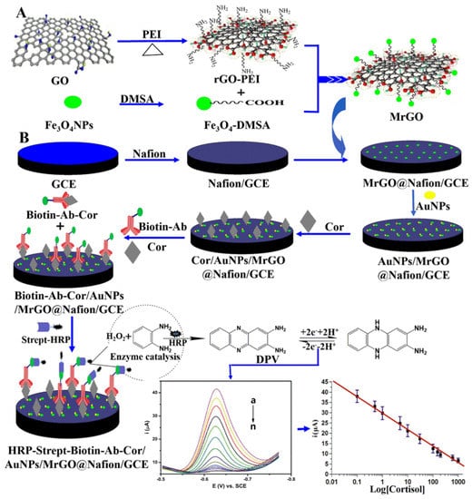 Scheme of the construction of the electrochemical cortisol immunosensor; (A) GO functionalization; (B) surface functionalization and detection mechanism (reproduced with permission from [67]. Copyright 2017 Elsevier).
