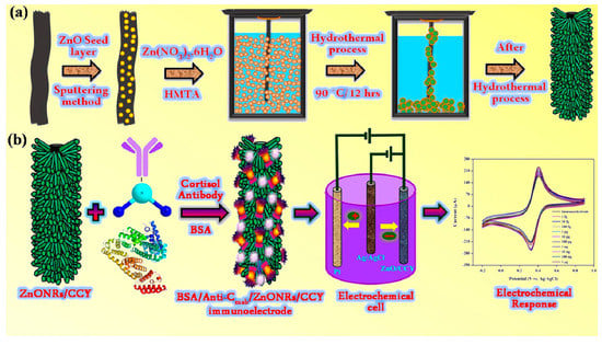 Schematic illustration of (a) insertion of ZnONRs on CCY and (b) step-by-step realization of an immunosensor with ZnONRs/CCY and electrochemical detection of cortisol (reproduced with permission from [73]. Copyright 2020 American Chemical Society).