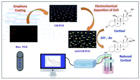 Rison and co-workers developed a new electrochemically conductive sensing electrode, based on ZnO nanoparticles electrochemically deposited on a pencil graphite electrode (PGE) coated with graphene [74] (Figure 14). The sensor was characterized using electrochemical techniques such as CV analysis and electrochemical spectroscopic impedance testing (EIS). This system can detect salivary cortisol amounts within a linear range of 5 × 10−10 M–115 × 10−10 M, with a LOD of 0.15 nM. These limits, the LOD, the LOQ, and the linearity interval were measured by Differential Pulse Voltammetry (DPV) studies. The possibility to detect cortisol with CV and EIS makes this system suitable for laboratory scales, and thus the practicability for real analysis should be improved.