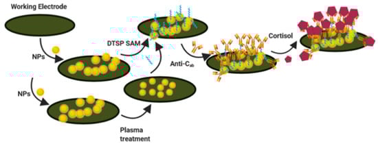 Steps in the fabrication of a cortisol immunosensor on untreated (drop-cast) and AuNP-modified plasma-treated electrodes (reproduced with permission from [75]. Copyright 2021 American Chemical Society).