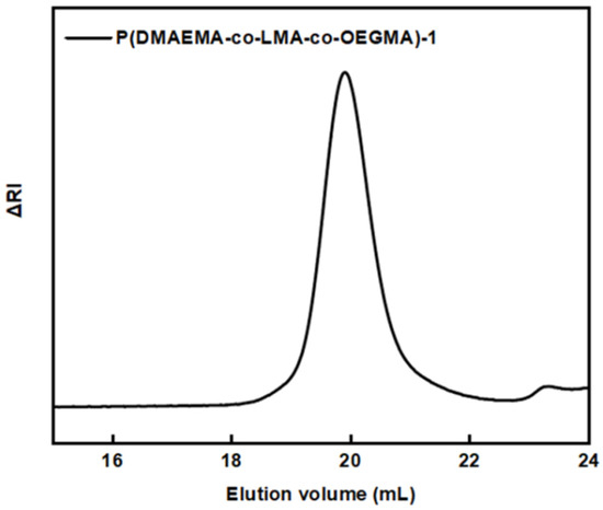 The synthesis of all five amphiphilic statistical terpolymers of the type P(DMAEMA-co-LMA-co-OEGMA) was performed by RAFT polymerization, as described in Scheme 1 below. As a CTA reagent, CPAD was selected for the polymerizations, as it is known from literature for its effectiveness in RAFT polymerization of methacrylic monomers [19].AIBN was utilized as a radical initiator and 1,4-dioxane as the polymerization solvent. The five terpolymers have different compositions by weight for each monomer. Based on the results obtained by SEC, the polymerization scheme has been proven successful. A typical chromatogram of a P(DMAEMA-co-LMA-co-OEGMA) terpolymer is shown in Figure 1. Analysis of the five chromatograms indicated the successful control of the molecular weight of the terpolymers, and the values of the molecular weight distributions were quite small (Đ < 1.2), as required by the theoretical background of the RAFT polymerization technique. It should be noted that molecular weights determined by the SEC are the apparent ones. Table 1 presents the molecular characteristics of all five terpolymers synthesized.