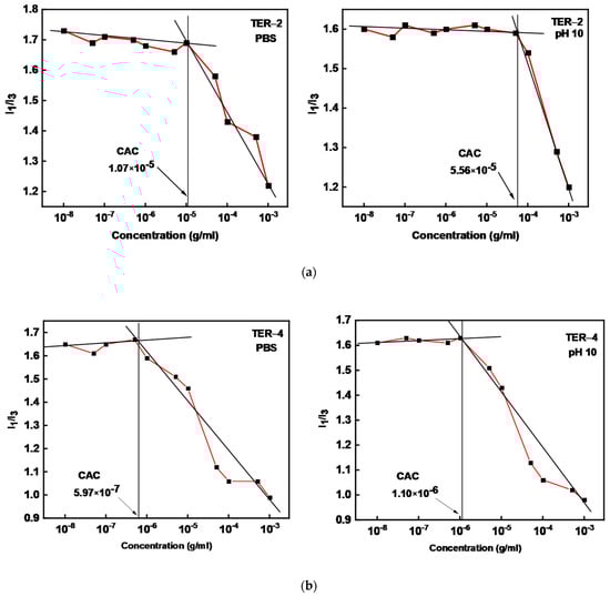 (a) CAC determination for TER-2 terpolymer; (b) TER-4 terpolymer in PBS (left) and pH = 10 (right), respectively. Red lines: are a guide to the eye, connecting all experimental points; Black lines: show how CAC was determined by the intersection point.