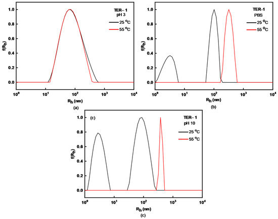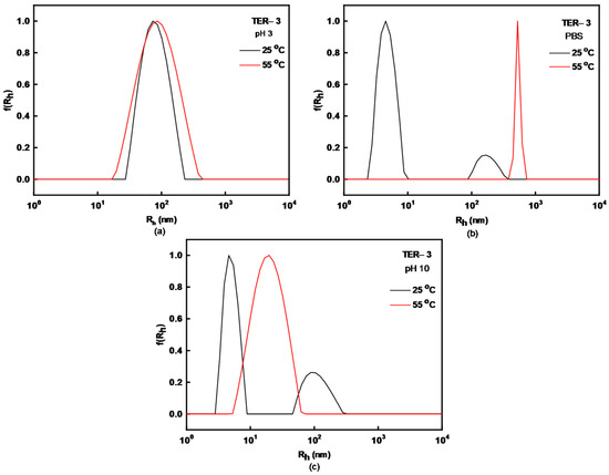 In order to determine the hydrodynamic radius (Rh) and the size polydispersity index (PDI) of the polymeric aggregates, dynamic light scattering (DLS) was performed. Scattering light intensity is strongly related to the mass of the formed nanoparticles. In Figure 4, the size distributions of the aggregates for TER-1 in three different pH values, at 25 °C and 55 °C, are presented. At pH = 3 the polymeric chains are fully protonated and at both 25 °C and 55 °C, a relatively wide monomodal size distribution is observed, indicating one population of aggregates in the solution. The large apparent size of the aggregates may be consistent with the existence of electrostatic interactions between charged polymer chains. An increase in temperature does not seem to affect the Rh distribution. The self-assembly of the nanoparticles in PBS (pH = 7.4) solutions at 25 °C seems to lead to the formation of two populations of different sizes. Part of the polymer system seems to be in the form of free chains, while the rest is in the form of aggregates formed due to the partial deprotonation of PDMAEMA, which results in lower solubility/higher hydrophobic interactions of the polymer chains. At 55 °C, the polymer forms a single population of aggregates having larger dimensions with relatively lower size distribution. This is due to further aggregation of the existing polymer nanoparticles/chains, which is a result of the reduced hydrophilicity of PDMAEMA parts by the increasing temperature. At pH = 10 two populations are observed again at 25 °C, with a transition to one larger population at 55 °C. Obviously, the increase in temperature here also favors the aggregation of the particles towards larger aggregates. The first (low Rh) peak in PBS solutions at 25 °C remains at the same position and increases in intensity when changing the pH to 10, probably due to the aggregation of free chains that may have remained, giving aggregates of similar size but larger mass. The environment is now alkaline, with PDMAEMA being completely deprotonated and, therefore, there is an enhancement of hydrophobic interactions, resulting in large size aggregates at 55 °C (and pH 10).