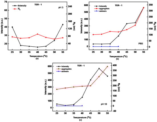 Next, electrophoretic light scattering measurements were performed, at pH = 3 and pH = 10. In an acidic environment PDMAEMA is protonated and is in cationic form and, therefore, the values ζp are expected to be positive. This coincides with the results presented in Table 2 for TER-1 and TER-3 copolymers. On the contrary, in an alkaline environment, where PDMAEMA is completely deprotonated, a reduction in ζp values is expected. More specifically, the resulting values were negative and far from zero. This is likely due to the –COOH end groups of the polymer chains originating from the CTA used, which due to the random arrangement are exposed to the surface of the particles and are deprotonated at pH = 10, displaying negatively charged groups –COO–. At the same time, there is a possibility that the negative charges at pH = 10 are due to adsorption of OH− ions on the surface of the particles. It is worth noting the presence of unimers in this polymer system in a wider range of temperatures in PBS and pH = 10 solutions (Figure 7). For the rest of the polymeric systems, the results are presented in Table S3.
