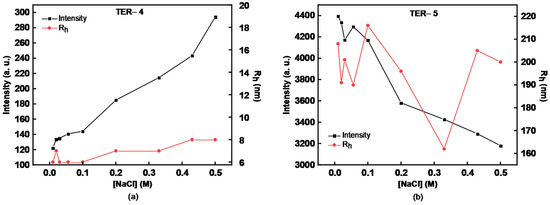 Figure 8 represents the effect of ionic strength (IS) on the aggregation behavior of terpolymers with a different ratio of hydrophobic to hydrophilic components. For TER-4 copolymer, which is mainly hydrophobic, it is observed that there is an increase in the scattering intensity (I, proportional to the aggregate mass) at higher salt concentrations, while no significant changes are observed in terms of aggregate dimensions. Polymer–water interactions are not favored, on the contrary, there are mainly polymer–polymer interactions. However, a similar trend is not observed in TER-5 copolymer solutions, which has a higher DMAEMA content and a lower LMA content. Initially, the system shows a tendency for aggregation, as indicated by the increasing Rh, but after the first five additions of salt (IS > 0.1 M NaCl) there is a decrease in scattering intensity that coincides with a sharp and temporary decrease in Rh, leading to the reduction in the size of nanoparticles. With the further addition of salt, the system returns to its primary dimensions, probably due to polymer–polymer interactions that are enhanced because of salt saturation in the solution. PDMAEMA is a weak polybase and as the pH decreases, it is in cationic form, developing weak electrostatic interactions between the polymer chains, as the salt concentration increases. As a result, there is a “collapse” of the system, adeaggregation with a possible shrinking of the structures, which is also the reason for the reduction in size and scattering intensity.