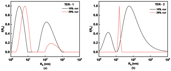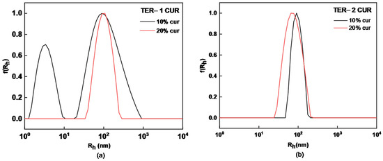 A single peak, with relatively narrow size distribution, shows that the polymeric aggregates that have entrapped the drug show colloidal stability, without being transformed into supra-aggregates. Generally, all the systems showed one population with the exception of TER-1 with 10% w/w curcumin, where two peaks were observed, while with an increase in the content of entrapped curcumin, the system eventually transforms to one population (Figure 9). Probably, the increase in the hydrophobic drug also helps in the better organization of the hydrophobic domains of the mixed polymer/drug aggregates and enhances their co-organization into nanoparticles. This can be confirmed in combination with the Rh results in the following table (Table 4). Comparatively, TER-2 copolymer is better organized, which, in both encapsulation rates, gave narrow peaks, low PDI values and relatively lower Rh values (Figure 9). These systems showed the same behavior in both protocols with better results when the percentage of encapsulation was 20% w/w, probably because the presence of curcumin actually helps in the construction of a more well-defined mixed nanostructure (Figure 10).