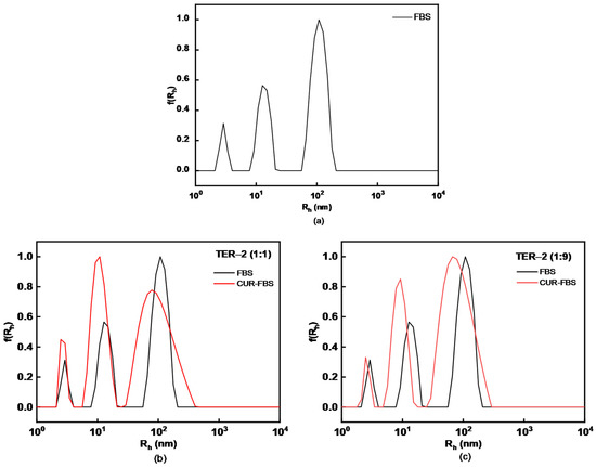 (a) Typical CONTIN size distribution of neat FBS, size distributions for (b) TER-2/CUR in FBS:PBS 1:1 and (c) TER-2/CUR in FBS:PBS 1:9.