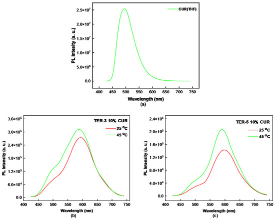 (a) Fluorescence of curcumin in THF (b) TER-3/CUR (c) TER-5/CUR mixed aggregates fluorescence signal as a function of temperature.