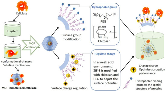 A pretreatment with ionic liquids (ILs) is known to facilitate hydrolysis of lignocellulosic biomass however ILs can degrade the enzyme [49,50]. Moreover, IL tolerance is an important parameter for in situ enzymatic saccharification of biomass to bioethanol in the presence of ILs, a promising industrial endeavor. Zhou et al. [44] studied IL tolerance of nanobiocatalysts based on several MOFs (with different metals) and physically adsorbed cellulase. Among four MOFs studied, ZIF-8 (MOFs which consist of Zn2+ and 2-methylimidazole ligands [51]) showed the highest enzyme adsorption capacity and remarkable tolerance to ILs. However, the most successful avenue for the protection of immobilized cellulase from the negative influence of ILs or desorption was found to be the modification of the support surface before or after cellulase adsorption. In this manner, a surface treatment of ZIF-8 with charge modifying compounds (chitosan) or hydrophobicity altering macromolecules (poly(ethylene glycol), PEG) allows for an increase of the enzyme loading capacity (Figure 1) [45].