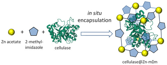 Zr-containing MOFs (UIO-66) with different mesopores (6.46, 7.55, 10.80 nm) were utilized to encapsulate several enzymes, including cellulase [56]. It is worth noting that cellulase has an ellipsoidal shape with a diameter of 4–6.5 nm and a length of 18–21.5 nm, therefore pores of suitable sizes can encapsulate the enzyme, although most probably adsorption also contributes in the immobilization process [57]. Surprisingly, the smallest pores allowed for the highest loading without jeopardizing the enzyme structure, as was verified by the comparison of the activity of free and immobilized enzymes. The specific pore structure of these MOFs (the presence of mesopores along with micropores) did not affect the mass transfer and allowed for an enrichment effect of the substrate, probably due to positioning of the latter at the support. An addition of 4.6 nm mesopores in microporous Zr-MOF obtained by biomineralization with dextran as sacrificial template allows better entrapment of cellulase within the material, improving loading capacity and stability of immobilized cellulase [58]. Mesoporous Zn-based MOFs were also utilized for cellulase encapsulation by simultaneous precipitation of the MOF precursors and cellulase (Figure 2) [59]. This significantly enhanced the cellulase loading and created structural defects during MOF formation (large pores), assisting in mass transfer and increasing enzymic activity.
