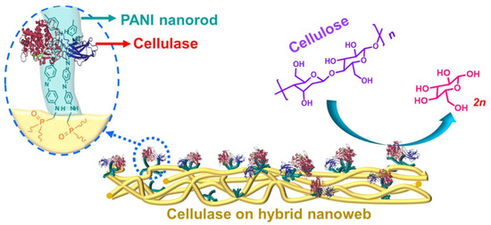 Hybrid cellulase-hydrogel nanobiocatalyst based on PANI nanorods formed on electrospun cationic poly(ε-caprolactone). Reproduced with permission from [72], Elsevier, 2022.