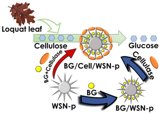 Schematic representation of the biomass waste hydrolysis to glucose with the nanobiocatalyst containing two enzymes adsorbed on sophisticated porous silica NPs. Reproduced with permission from [27], American Chemical Society, 2022.