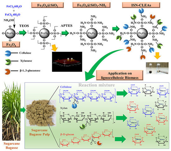 The same avenue was utilized by Muley et al. using fermentation broth of the Aspergillus niger culture containing cellulase, pectinase, and xylanase and covalently immobilizing them on magnetic NPs [26]. Here, pectinase degrades pectin, which improves saccharification of pectin-rich biomass [137]. A mixture of cellulase, xylanase, and β-1,3-glucanase (degrading glucan chitosan) were attached to silica coated iron oxide NPs containing amino groups on periphery and used for hydrolysis of sugar cane bagasse pulp into monomeric sugars with high activity and reusability (Figure 9) [138].