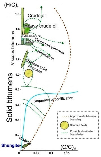 Hydrocarbon compounds (primarily petroleum and bitumen) under the physicochemical conditions of the earth’s crust are transformed in the direction of carbonization (or dehydrogenation), with the elimination of most non-carbon components (Figure 1) [2], and in the direction of graphitization as a structural rearrangement of the aromatic skeleton formed during carbonization into a stable-layered graphite structure (sp2-hybridized) [3,4,5]. The process of graphitization of hydrocarbon compounds is irreversible, but it is not always terminated with the formation of graphite, both in terms of structure ordering and in terms of removal of hydrogen, oxygen, nitrogen, and sulfur heterocompounds. Condensation of carbonaceous matter can occur at the stage of formation of graphite-like nanostructures of various degrees of order and sizes [6] and can also end with the formation of structures such as multilayer ribbons and fullerenes [7,8]. In the sequence of carbonization (dehydrogenation) of hydrocarbon compounds, according to their physicochemical properties, a class of substances of the highest degree of transformation (carbonization) was distinguished, which was characterized by the so-called pre-graphite structural stage [9,10,11]. Such substances are distinguished by an almost pure carbon composition (usually over 95%) and the absence of solubility in organic solvents (for example, chloroform), and their distinctive physical property is electrical conductivity. According to the indicated properties, these substances are similar to graphite, while their critical difference with graphite is the absence of a bulk crystal structure (three-dimensional hkl reflections on X-ray and electron diffraction patterns). There is only two-dimensional graphite-like ordering as the proximity of interplanar distances to the 002 graphite plane. Dsp2C is porous, and accordingly has a lower density (1.5–2.2) and a larger specific surface area than graphite.