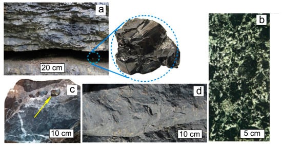 Dsp2C is often present in oil and gas basins and in ore deposits of hydrothermal origin [11,12,13]. The geological conditions for the formation of such carbon in petroleum and gas source formations are deep catagenesis, metamorphism, intrusive magmatism, and post-magmatic hydrothermal activity [14,15,16]. The occurrences are known in rocks of all ages, including the most ancient Precambrian paleobasins, more than 2 billion years old. The scale of occurrences of Dsp2C in the Earth’s crust varies over a very wide range. Dsp2C both fills micro-sized pores in rocks and forms multi-meter reservoir deposits and large veins tens and hundreds of meters long (Figure 2). The occurrences of Dsp2C have been found on all continents. The most fully characterized in the literature is the non-crystalline carbon of shungite occurrences in Karelia (Lake Onega region, Russia) [17,18]. Interest in shungite carbon increased after the first discovery of fullerenes of geological origin in it [19]. In addition to the shungite rocks of Karelia, significant occurrences with well-characterized structure and properties of Dsp2C (referred to in the geological and mineralogical literature as anthraxolites and pyrobitumen) are located in Bakyrchik (Kyzyl fault zone, Kazakhstan) [20,21,22], Mitov (Bohemian massif, Czech Republic) [23,24], Novaya Zemlya island (Russia) [25], Sichuan province (China) [26], the Sudbury Astroblem (Canada) [27,28,29], the Franceville Sedimentary Basin (Gabon) [30,31], the Michigan Formation (USA) [32,33], and many others.